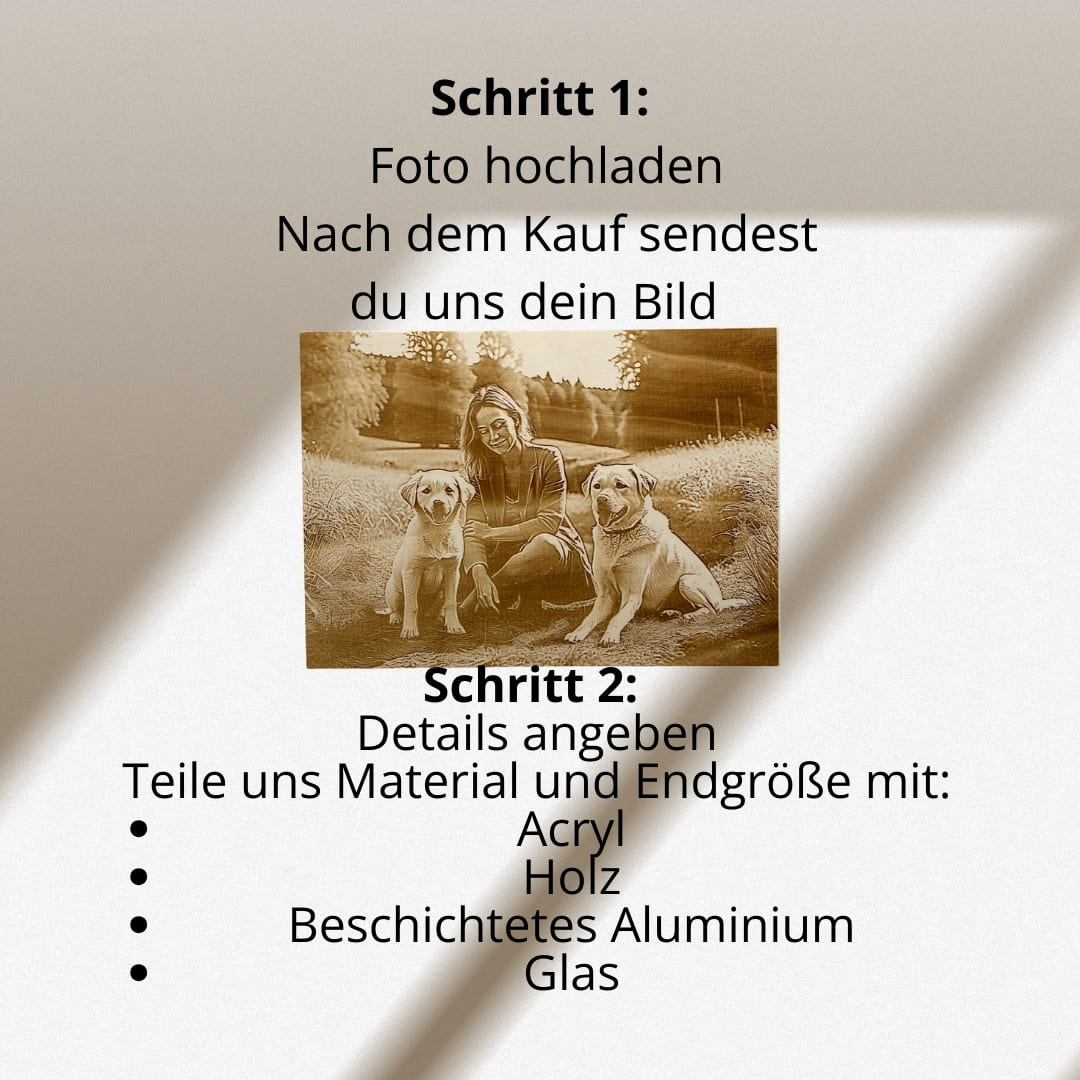 - Foto hochladen: Nach dem Kauf sendest du uns dein Bild (möglichst hochauflösend).