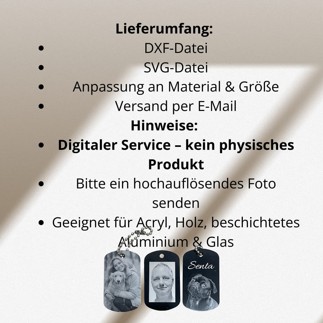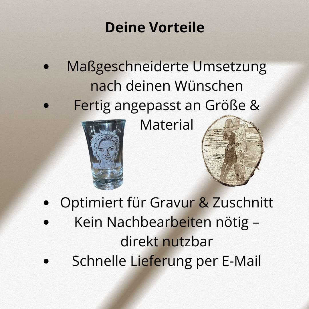 Wir verwandeln dein Foto in eine präzise, lasertaugliche Datei – passend für dein Material und fertig in deiner voreingestellten Endgröße.